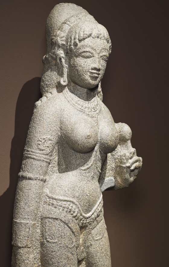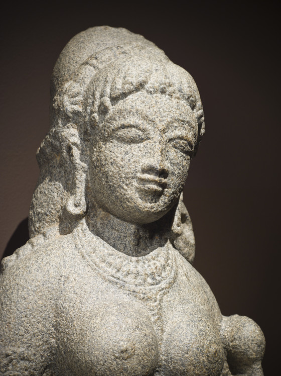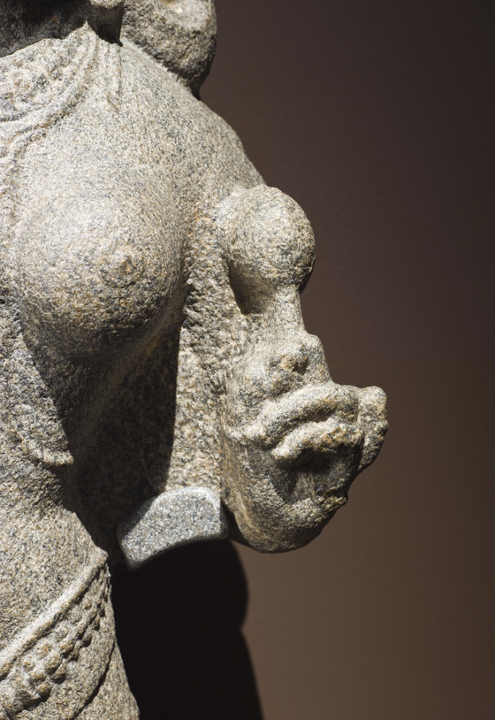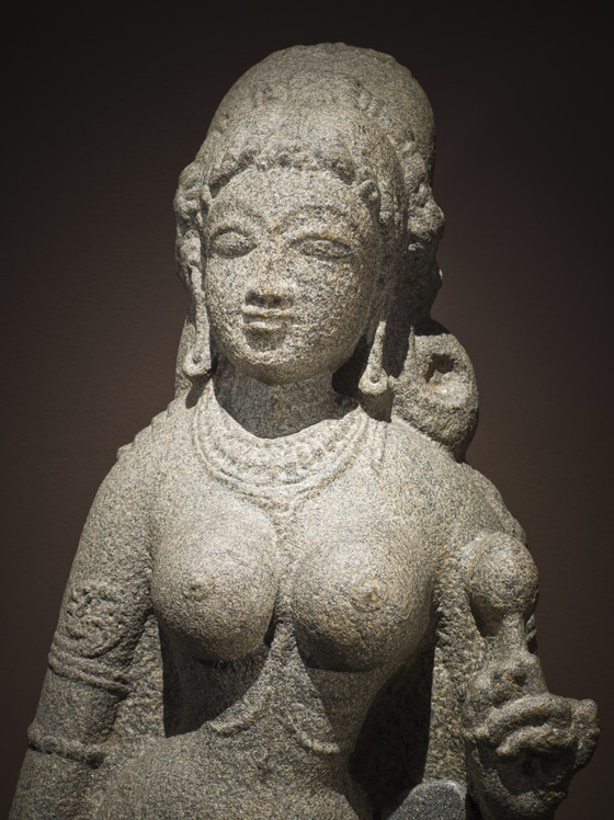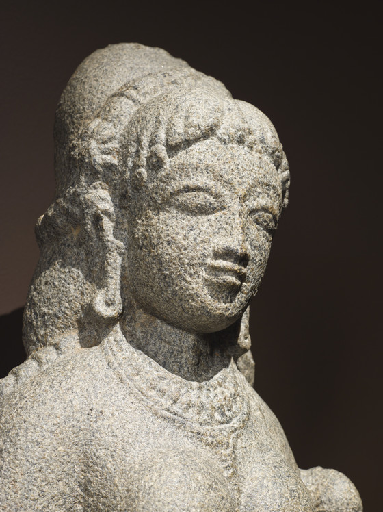 Sita is the heroine of the Ramayana (Adventures of Rama), which narrates the legendary life and times of the valiant Prince Rama and his dutiful wife, Princess Sita, who was abducted by Ravana, the arrogant ten-headed demonic King of Lanka (probably modern Sri Lanka), during Rama’s unjust fourteen-year forest exile from his capital of Ayodhya (near present-day Faizabad in northern India). Upon learning of her captivity by Ravana, Rama and his faithful brother Lakshmana assembled a great army of monkeys and bears led by the Monkey-King Sugriva and his General, Hanuman, in order to attack Lanka and rescue Sita. After several magical battles, the princess was freed and the happy couple returned home to rule. But the public doubted Sita’s loyalty to Rama during her captivity and she was forced to undergo a trial by fire to prove her innocence. Sita is also the Hindu goddess of beauty and devotion, a mother goddess, and an avatar of the goddess Lakshmi. This granulite sculpture likely represents Sita as a goddess rather than in her narrative role.