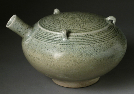 Wheel-thrown stoneware with applied and incised decoration and green glaze
