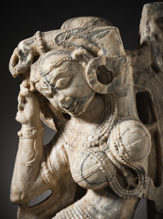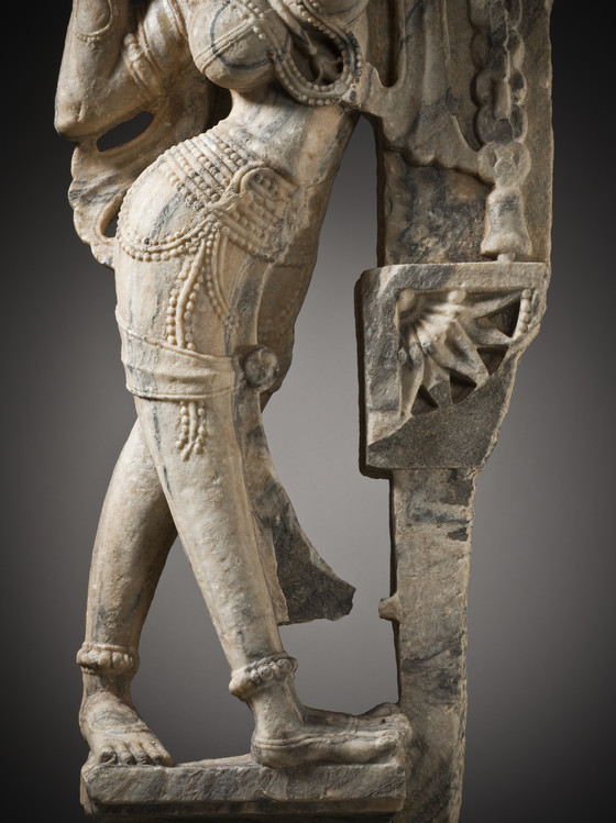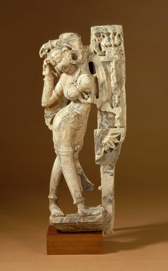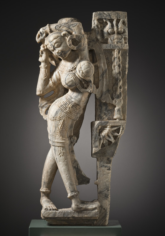 Related iconographically to the slightly earlier representation of a celestial nymph also from Rajasthan (M.71.73.132), this larger and heavier sculpture served a different architectural function. It was most likely originally situated on an exterior wall of a Jain temple rather than as a bracket figure on the interior ceiling dome. The nymph twists at an acute angle to look towards the ground behind her. Her left arm goes over her head and may have once held a now-missing disk or other indeterminate object, while her raised right hand may have grasped its lower edge. She is richly adorned with jeweled ornaments and cascading strands of pearls. A long flowing scarf (dupatta) is around her shoulders, and another is knotted above her knees. The sculptor has taken delight in portraying the celestial nymph in a contorted dancing posture emphasizing her suppleness and has displayed considerable technical expertise in utilizing the dark striations of the rock to accentuate the swollen volumes of her breasts and other features. She stands beside a rectangular pillar or pilaster ornamented with a leonine face-of-glory (kirttimukha), a bell hanging from a chain, and a spandrel with a radiant quarter-lotus.