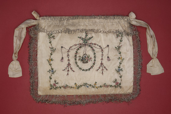Silk satin with silk thread embroidery, silk ribbon and foil bullion appliqué, sequins, and silk and metallic lace