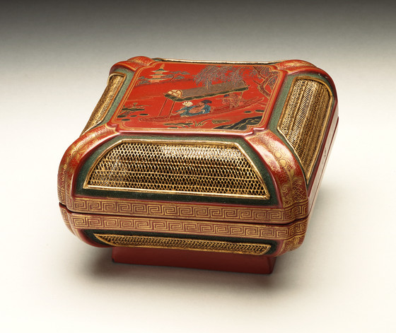 Lacquer on wood core with painted decoration and gilded wickerwork panels