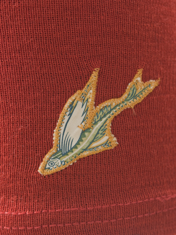 Swimsuit: wool knit with rayon plain weave, printed, with appliqué; Belt: cotton braid (webbing), leather, and metal