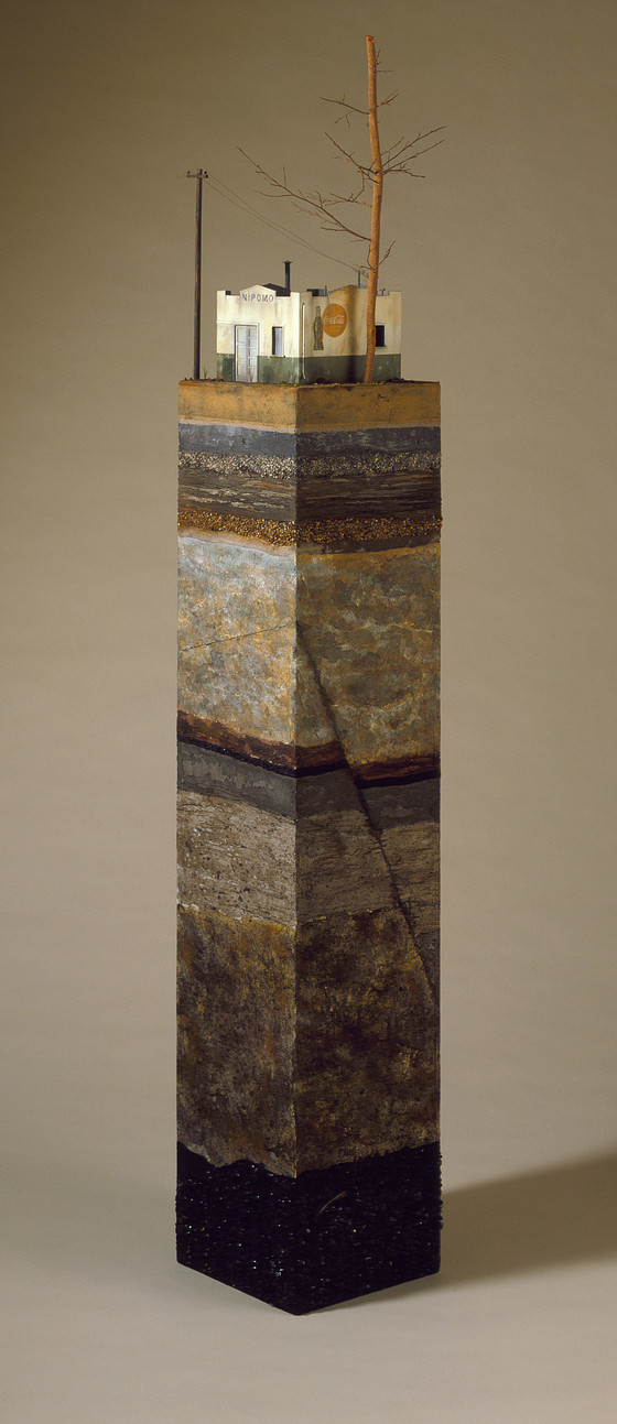 Wood, Masonite, paper, poultry femur, crushed stone, Carborundum grit, metal, glass, acrylic paint, oil paint, desiccated plant material, ink, graphite, and epoxy