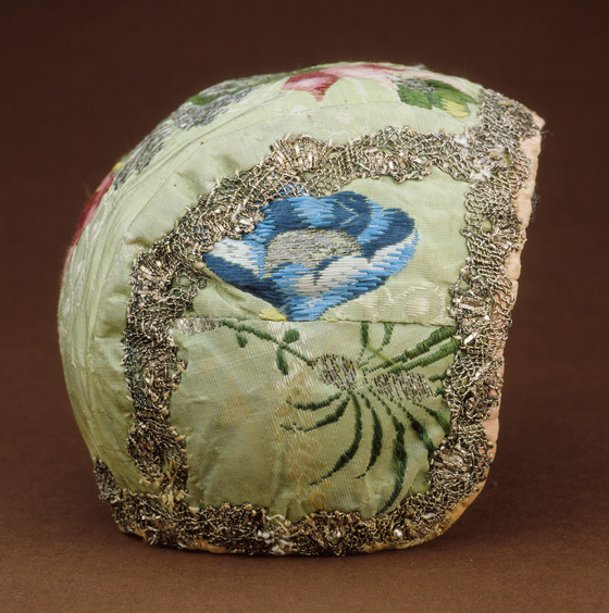 Silk plain weave with silk and metallic-thread supplementary weft patterning and metallic-thread lace