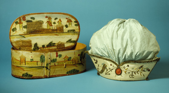 a) Work bag: Silk and gold embroidery, sequins, paste stones, wax seals, painted wood; b) Box: Painted wood; c) Lid: Painted wood