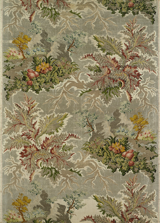 Silk plain weave with silk, metallic-thread, and metal-strip discontinuous supplementary weft patterning (brocade)
