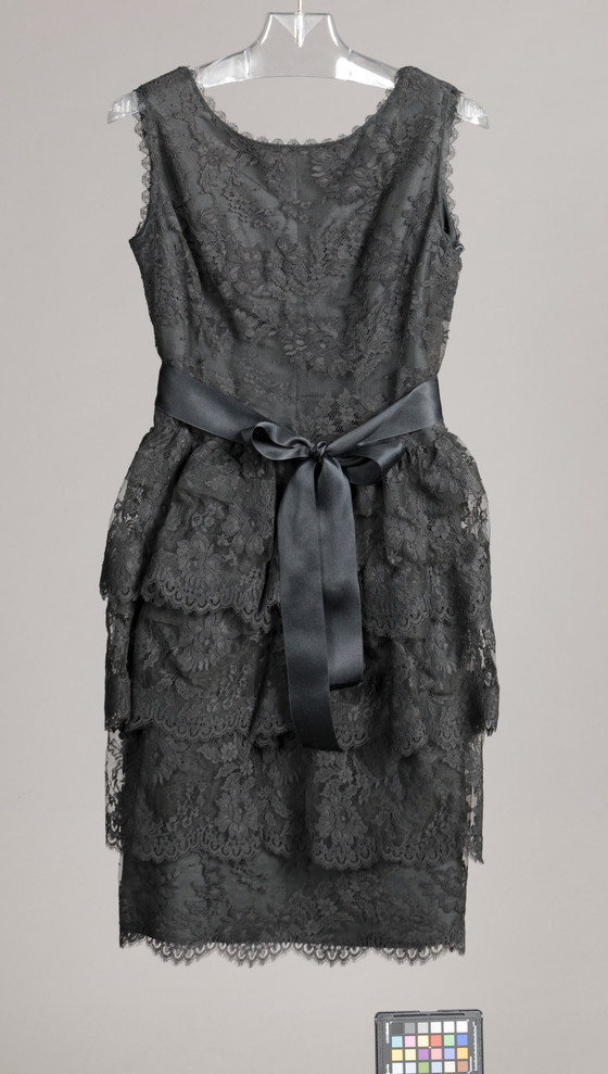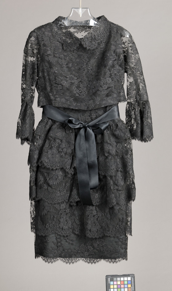 Jacket: silk lace; Dress: silk lace and silk satin; Sash (attached): silk satin ribbon