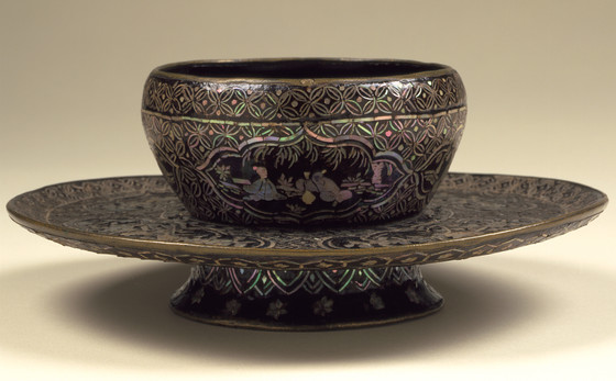 Black lacquer on wood core with mother-of-pearl inlay