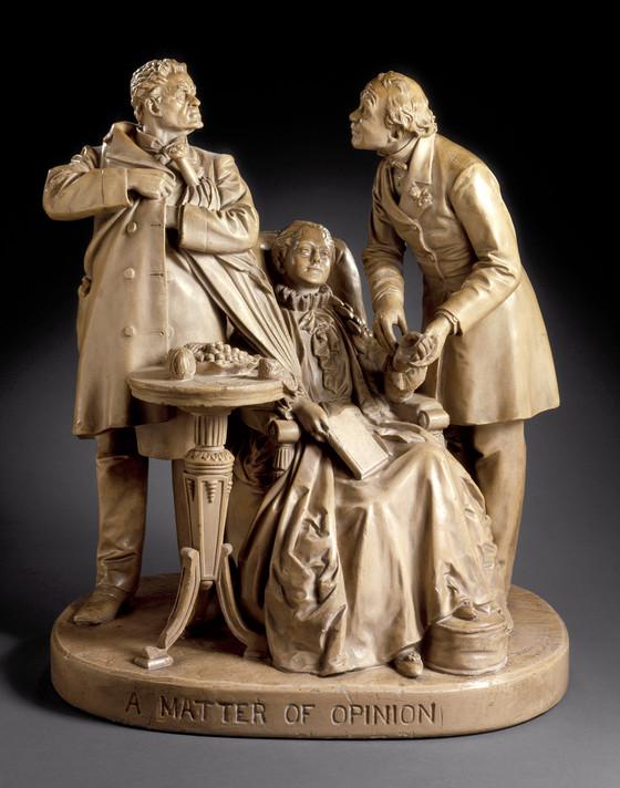 This is one of five sculptures Rogers made of physicians. He began A Matter of Opinion early in 1884, after devoting his time to the equestrian statue of General Reynolds, and finished it by April 23, although he did not issue it for sale until the Christmas season. It was advertised in the Medical Record as suitable for a physician’s office. A Matter of Opinion is a standard Rogers composition: three figures are arranged symmetrically and convey the story through their poses and expressions. The sculptor described his humorous representation as "a consultation of physicians over an invalid lady-which results in an evident disagreement." One physician, taking the woman’s pulse, gives his opinion, while the other, obviously indignant over the diagnosis, reacts by glaring at his opponent and buttoning his coat to leave. Typical of Rogers’s late groupings are the wealth of detailed accessory objects, close placement of the figures, and sense of movement. About sixteen to twenty examples of the work are known (see Wallace, People’s Sculptor, p. 251, for partial listing of collections).