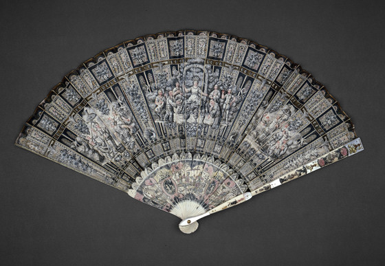 Silk leaf, ivory sticks, ivory guards with mother-of pearl-inlay, brass metallic rivet