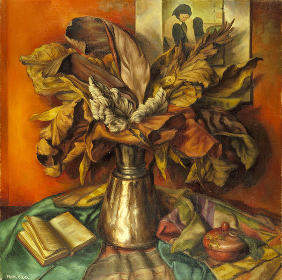 Although his figure paintings often focused on the common laborer, Kirk’s still lifes presented a more refined world, usually depicting works of art, oriental porcelains, and textiles arranged around large floral bouquets. In Rhapsody the artist included a print, a covered lacquer dish, a book, and a large arrangement of dried flowers and leaves in a gleaming copper pitcher. The highly varied palette of deep hues contributes to the painting’s rich elegance. Kirk’s tabletop arrangements were in the tradition of the work of Paul Cézanne (1839-1906) but took on a rigidly standardized format. He repeatedly used the same objects, viewed them from an elevated viewpoint, and only slightly varied their positions within a triangular arrangement before a wall. For example, the same arrangement and bouquet in Rhapsody are found in Tropical Leaves, n.d. (unlocated, reproduced in Weinper, Kirk, p. 59). It is primarily his use of texture and color that distinguishes one still-life painting from another. According to labels on the back of the canvas and stretchers, the painting was widely exhibited under the titles Rhapsody and Tropical Leaves, but attempts to verify these exhibitions have been futile or resulted in contradictory information.