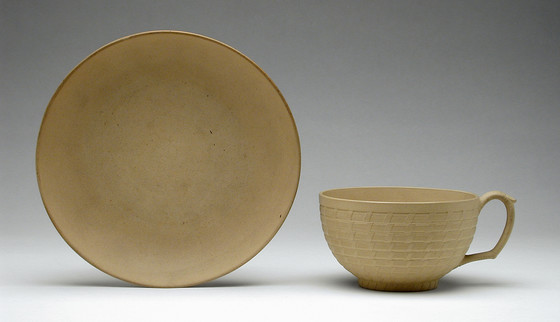a) Cup: Height: 2 in. (5.08 cm), Diameter: 4 1/2 in. (11.43 cm); b) Saucer: Diameter: 5 1/2 in. (13.97 cm)