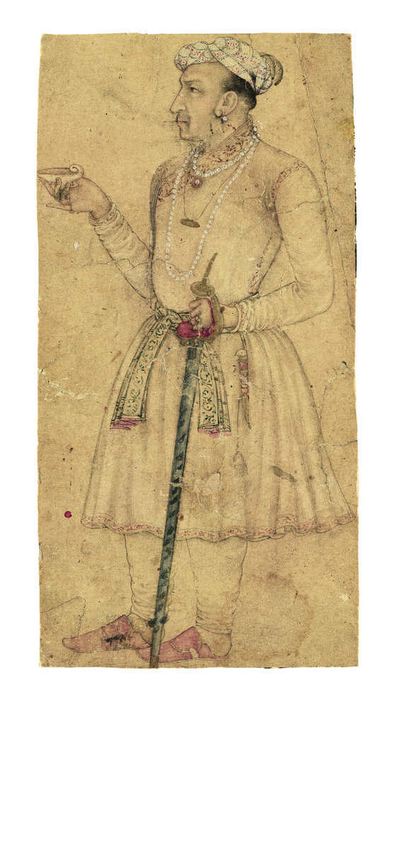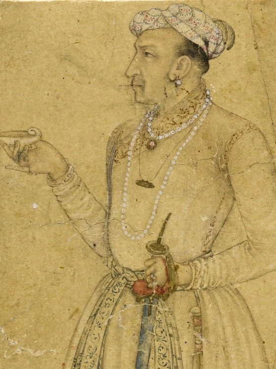 Emperor Jahangir (r. 1605-1627) was born in 1569. His birth name was Nur-ud-din Muhammad Salim. He was known as Shah Salim during his rebellion from his father Emperor Akbar (r. 1605-1627), when he established an independent court at Allahabad in 1600-1604. He had been given the name of Salim in honor of Shaikh Salim Chishti (1478–1572), a revered Sufi saint in whose abode he was born in Sikri, near Agra. In this sensitive nim qalam (half-pen) lightly tinted drawing, Jahangir wears a delicately colored cloth turban (pagri) topped with a feather plume (jigha). He wears a pierced pearl earring indicating that he is an ‘ear-bored slave’ or follower of the Sufi saint Khwaja Muin al-Din Chishti (1143–1236), which he began wearing in August 1614 after crediting the saint with his recovery from a severe illness. Around his neck he wears two strands of pearls, an amulet case (see M.76.2.25), and what may be a miniature portrait (shast). He wears a long white coat (jama) with a border matching his turban decoration and a waist sash with a bird-headed knife suspended from it. In his right hand he holds a white jade wine cup (see M.76.2.1). His left hand grasps the grip of a “Firangi” (European) straight sword with a basket hilt and pommel spike.