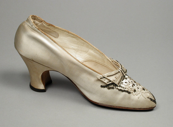 Silk satin, with silk plain reave ribon embroidery, metal beads, and leather