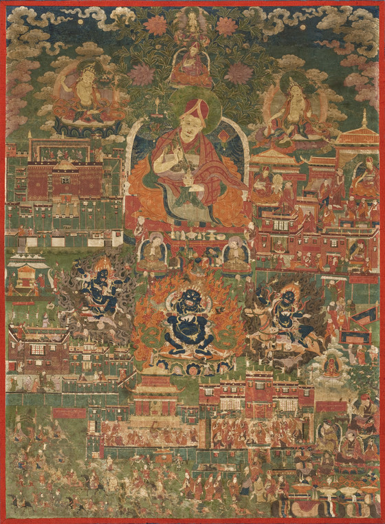 The Sakyapa hierarch depicted directly above Kunga Tashi represents either his father, Sonam Wangchök (1638–85), or another great Sakyapa teacher. The two monks who commissioned this painting are seated below Kunga Tashi and, according to the inscription, are "praying to obtain his favor." The presence of Manjushri above Kunga Tashi’s right shoulder and Tara, the female Bodhisattva of Compassion, above his left symbolize his Enlightenment. The Buddha Vajradhara, who is considered to be the source of Sakyapa teachings, is depicted at the top center. Below the throne, Mahakala as the Lord of the Pavilion, the tutelary (protective) deity of the Sakyapa, is flanked by two forms of the fierce female deity, Palden Lhamo.