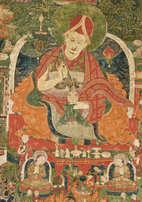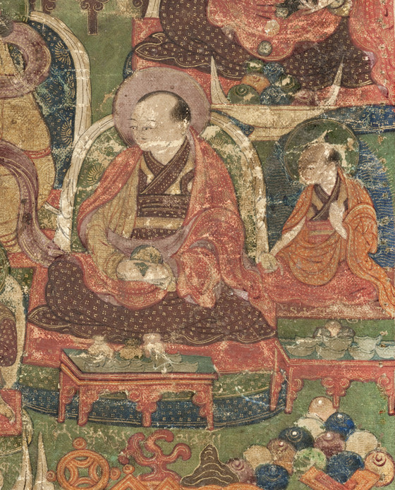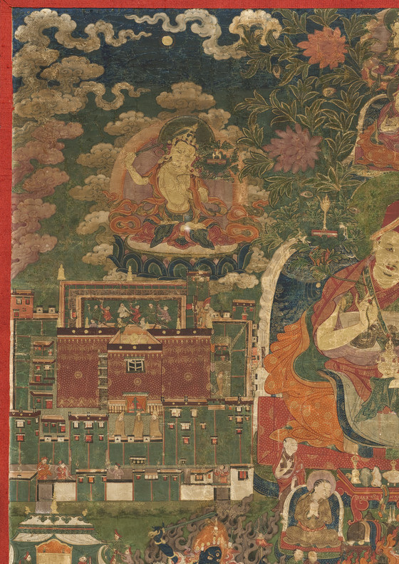 Kunga Tashi, the central figure in the painting, is depicted wearing the distinctive red hat of a Sakyapa hierarch. In his left hand, he holds the flowering Vase of Immortality, associated with the Dhyanibuddha of Unmeasured Life, Amitayus. In his right hand, he holds a lotus stalk surmounted by the manuscript and flaming sword of Manjushri, the Bodhisattva of Wisdom. Kunga Tashi orders his treasurer, to his left, to have a golden statue made and a temple built.