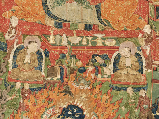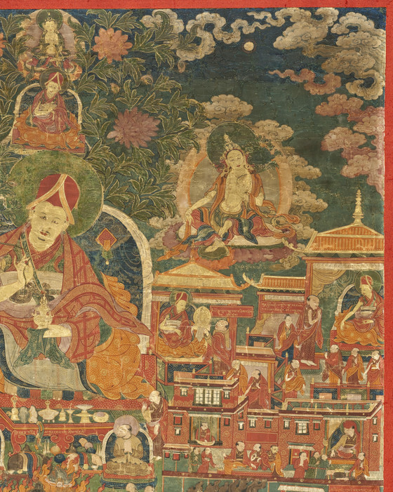 This painting exemplifies the stylistic changes that spread throughout central Tibet during the late 17th century. Traditionally Sakyapa paintings were strictly symmetrical. Influenced by Chinese art, Tibetan artists began to incorporate landscape elements into their paintings and to create more active compositions. Kunga Tashi is asymmetrically posed, and the events of his life are identified by inscriptions and divided by thin areas of landscape. Each portion of the story is descriptively portrayed within an architectural setting, rather than being subsumed by just the principal figures.