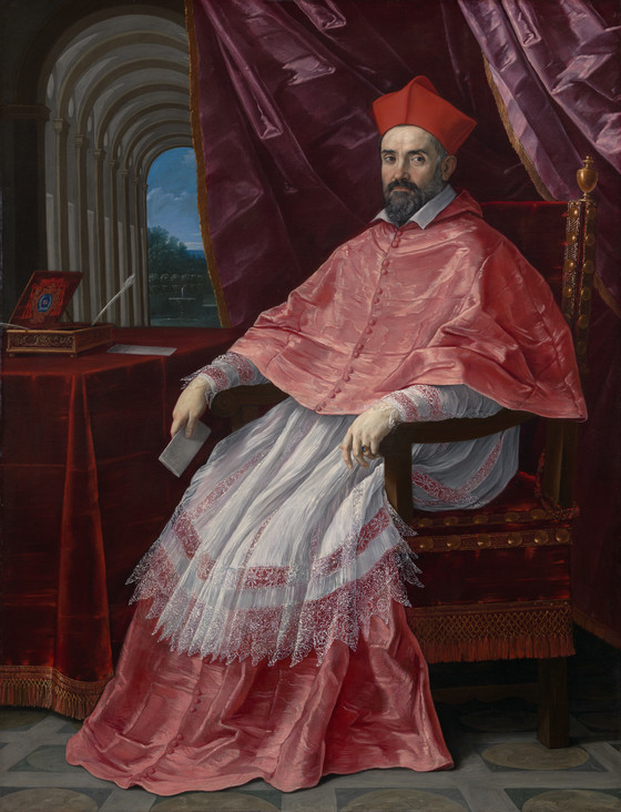 (1) According to Jennifer Montagu, "there are two Ubaldini inventories, the second of which is apparently a continuation of the first, made for his residuary legatee, the Propaganda Fide. Both are in the Archivio di Stato, Rome, Notaro della Tribunale dell’Auditor Camerae, Belgius. The first begins on 26 April 1636 and is in vol. 696, fols. 751–806; the second begins on 4 May and is in vol. 697, fols. 103–15v, 156–65r" (letter dated 22 April 1987, Reni object file, Department of European Painting and Sculpture, LACMA). Vol. 696, fol. 757v (Nella stanzino che responde sopra alla strada del Borgo S[anto] Sp[irt]o): "Un altro quadro grande di d[ett]o Card[inal]e a sedere di Guido Reno con cornice di legno rauescate d’oro." Two other unattributed portraits of the cardinal are also mentioned.