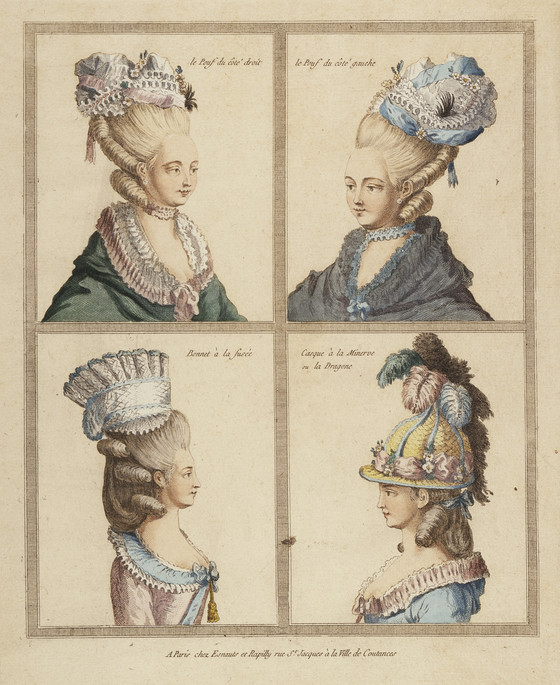 France, Rapilly, 18th Century Print showing Headdresses Engraving, hand-tinted gouache 11 5/8 in. X 9 3/8 in. (29.5 x 23.8 cm.)