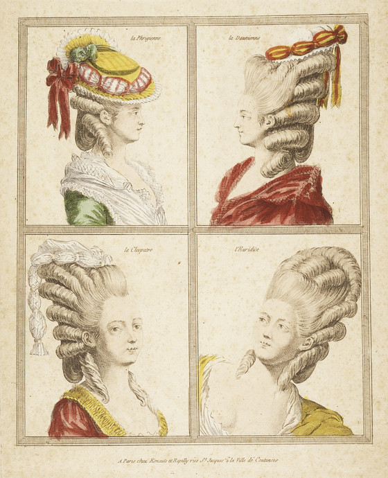 France, Rapilly, 18th Century Print showing Headdress Engraving, hand tinted, gouache Sheet: 11 5/8 x 9 3/8 in. Comp: 9 6/8 x 7 7/8 in.