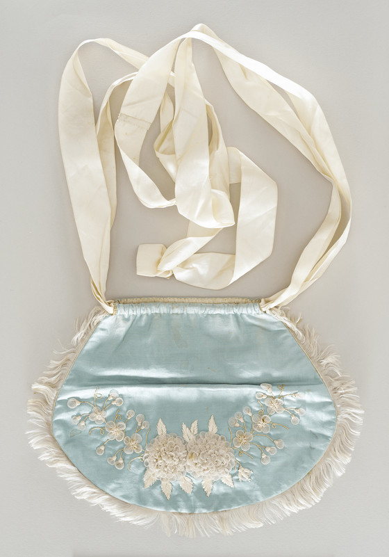 Silk satin with silk embroidery, bast ribbonwork, silk fringe, and silk satin ribbons