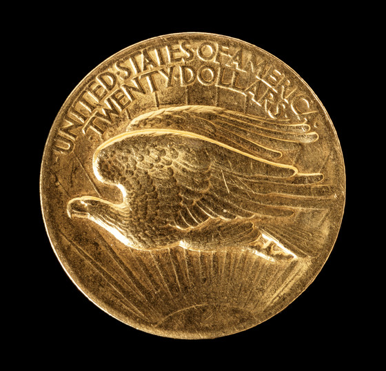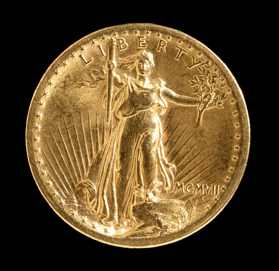 Differences of opinion with the mint officials regarding the practicality of the high relief delayed the minting until after the sculptor’s death. At the president’s insistence a small number of experimental, extra-high-relief versions of the twenty-dollar coin were struck, and then an edition of high-relief coins was minted. Because these high-relief coins had to be struck on a medal press, rather than a regular coin press, and because they would not stack, Charles E. Barber (1842-1917), the mint engraver, then modeled a coin in flat relief and changed the date from Roman numerals to the Arabic 1907. The museum’s coin is part of the regular issue in high relief, put into circulation in December 1907, before the Barber-modified final issue.