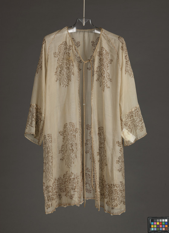 Silk gauze, printed, with cotton and metallic-thread cord and glass beads