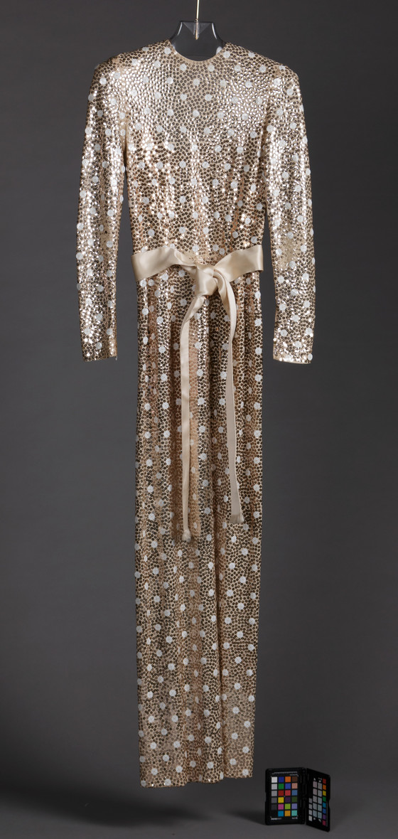 Silk knit (jersey), plastic sequins, silk satin ribbon