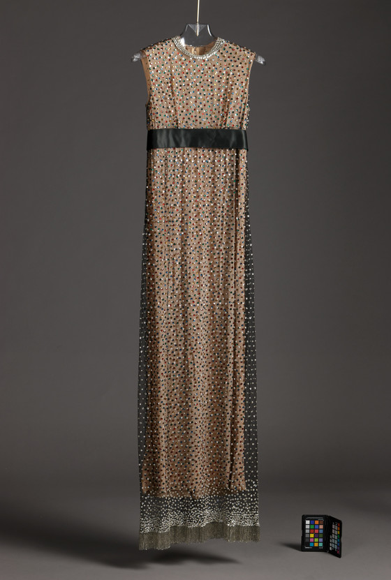 Silk plain weave (crepe) and silk net with crystals, glass beads, and silk satin ribbon