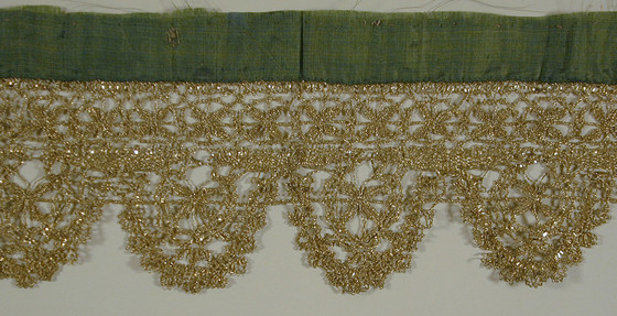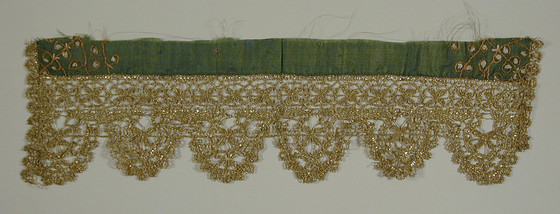 Silk core wrapped gilded silver thread and metal strip bobbin lace with silk embroidery