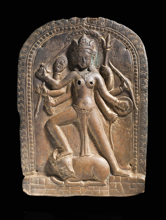This inscribed repoussé copper alloy plaque was likely originally a metal sheath for a stone, wood, or earthenware image (kosha or kavaca). It depicts one of the most popular female deities in Hinduism, Durga (Unconquerable), in her aspect as the slayer of Mahisha, the buffalo demon. She is the powerful goddess of the battlefield who plays a vital role in the eternal struggle between good and evil. Durga was traditionally invoked by warriors before they went into battle. When the gods were unable to conquer the powerful Mahisha, who had received a boon from the god Brahma that he could only be killed by a woman, Durga was created from the energy of the gods’ combined anger to fight for them. Each god gave her a portion of his powers, and she carries their various weapons in her multiple arms, including the trident of Shiva, the discus of Vishnu, and the spear of Karttikeya. The myth of Durga's slaying of the buffalo demon may be interpreted primarily in sectarian terms, as proclaiming the powers of the goddess over those of the gods; anthropologically, however, it may also represent the assimilation into mainstream Hinduism of a totemistic buffalo cult.