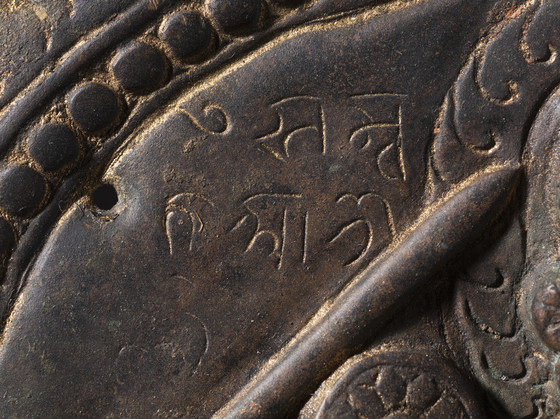 A devanagari inscription on the aureola’s plain inner area beside her head and left leg furnishes a date of (Nepal samvat) 310, corresponding to 1090 CE. The donor’s name is illegible. (See Ian Alsop, "Repousse in Nepal," Orientations 17: 7 (July 1986), pp. 17-18, Fig. 4.)