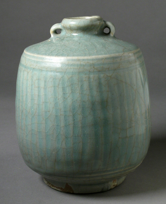 Wheel-thrown stoneware with carved and incised decoration and celadon glaze
