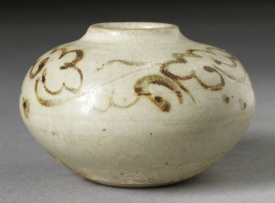 Wheel-thrown stoneware with cream slip, underglaze brown painted decoration, and clear glaze