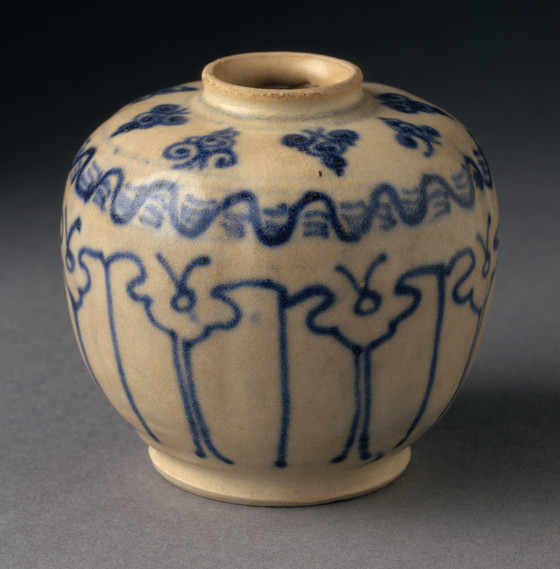 Wheel-thrown stoneware with cream slip, underglaze blue painted decoration, and clear glaze