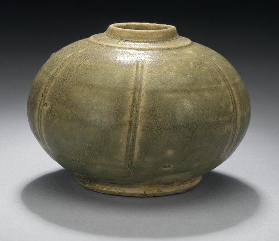 Wheel-thrown stoneware with incised decoration and celadon glaze