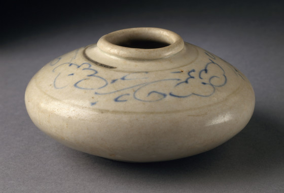 Wheel-thrown stoneware with cream slip, underglaze blue painted decoration, and clear glaze