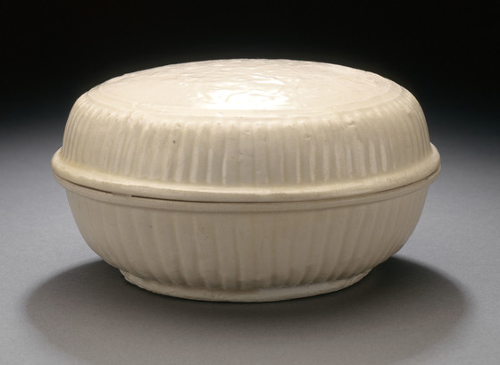 Wheel-thrown porcelain with molded decoration and cream glaze
