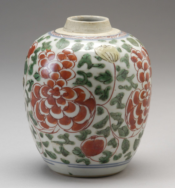 Stoneware with red, green, and yellow enameled decoration and clear glaze