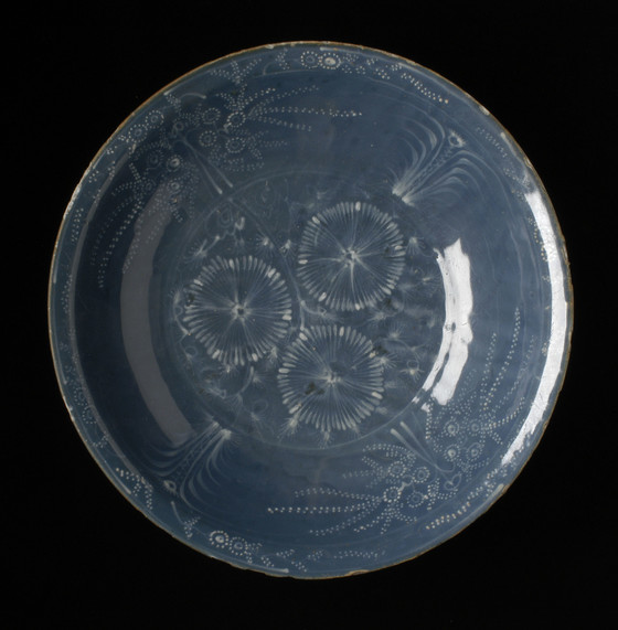 Porcelain with raised white slip decorations and translucent blue glaze