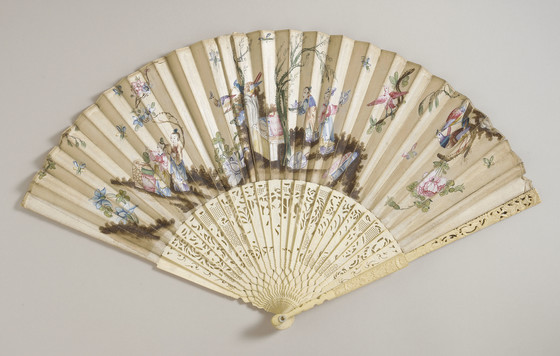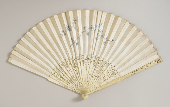 Paper leaf, painted, gold leaf, bone sticks and guards, brass metallic rivet, mother-of-pearl button