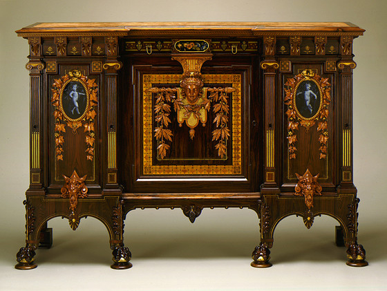 Rosewood, maple, other exotic woods, pietre duré, marble, brass inlay, oil painted panels, velvet
