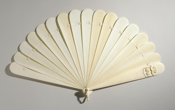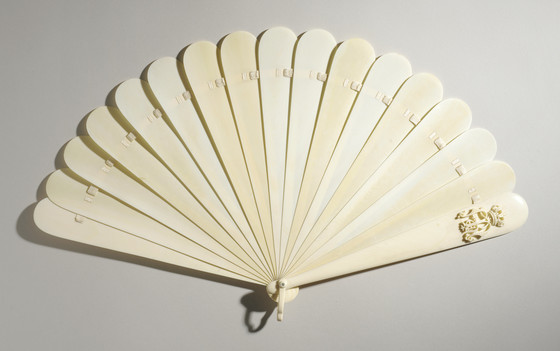 a) Fan: Ivory sticks and loop, fifteen ivory leaves, silk ribbon; b) Box: paper