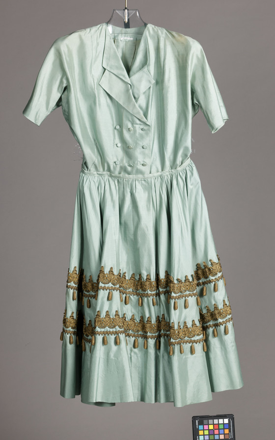 Blouse: silk plain weave, silk taffeta; Skirt: silk plain weave with metallic thread trim and tassels.