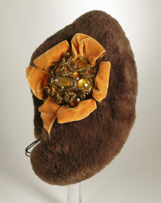 Beaver fur, velvet ribbon, metallic wire, paste stones
