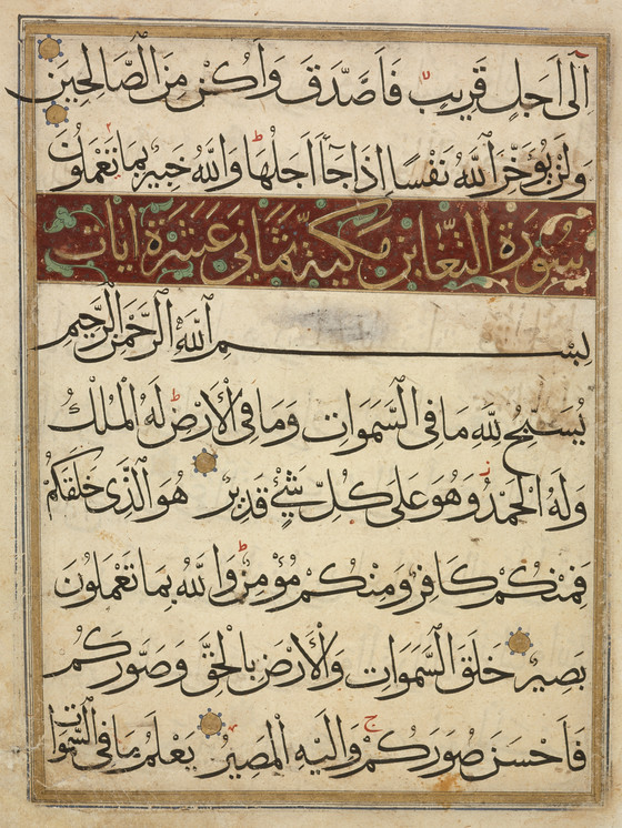 Page from a Manuscript of the Qur'an (63:10--11, 64:1-4; 64:4-9)