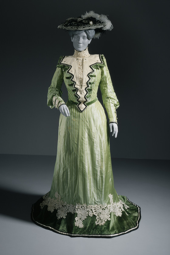 Bodice: silk plain weave (taffeta) with supplementary warp patterning, wool plain weave (broadcloth), lace, and silk velvet trim with metal and faux pearl buttons; Skirt: silk plain weave (taffeta) with supplementary warp patterning, wool lace, silk satin, and silk plain weave with supplementary warp float pattering