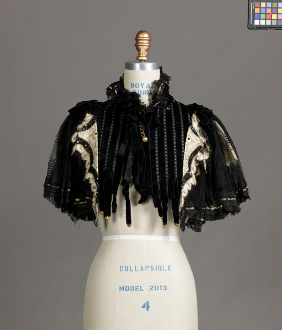 Silk plain weave (faille), moiré finish, silk net, silk velvet, and linen lace with metallic-thread embroidery, metal sequins, metal ornaments, metal and glass beads
