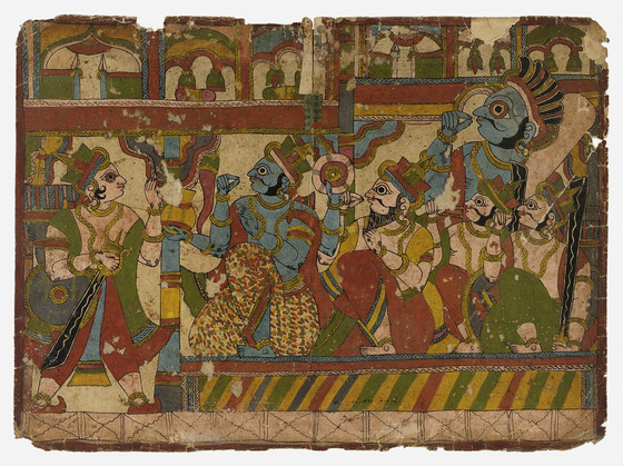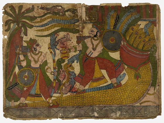 Babhruvahana Leaving the Netherworld with the Elixir (recto), Babhruvahana Hands Over the Elixir to Krishna to Resurrect Arjuna (verso), Scene From the Story of Babhruvahana, Folio from a Mahabharata ([War of the] Great Bharatas)
