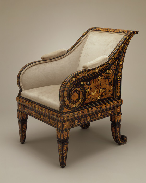 Ebony, inlays, mother-of-pearl, ivory, cottonwood, northern cedar, upholstery (replaced)